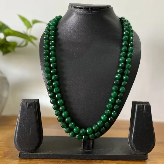 This beautifully handcrafted neckpiece features two graceful layers of smooth emerald jade beads that radiate a soft, natural allure.
