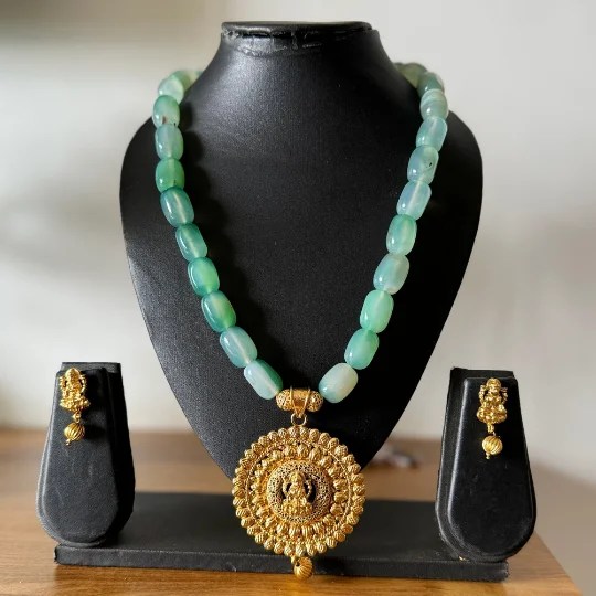 This stunning handcrafted jewelry set features a bold necklace and matching earrings, perfect for making a statement. The necklace is composed of large, square oval-shaped beads in pastel green shade. These beads have a natural, semi-precious stone appearance. They are complemented by a pair of intricate, gold-toned beads near the center, which add a touch of traditional craftsmanship. The centerpiece is a large, circular gold-toned pendant which features a finely detailed central figure of Goddess Lakshmi. The matching earrings are a simple yet elegant drop style.