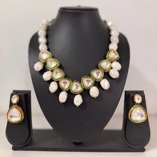Grace your look with this stunning pearl and kundan necklace set, blending tradition with timeless charm. The necklace features triangular kundan stones bordered in green enamel and paired with lustrous baroque pearl drops that add a luxurious touch. Strung on a line of classic pearls, the design balances opulence with elegance.