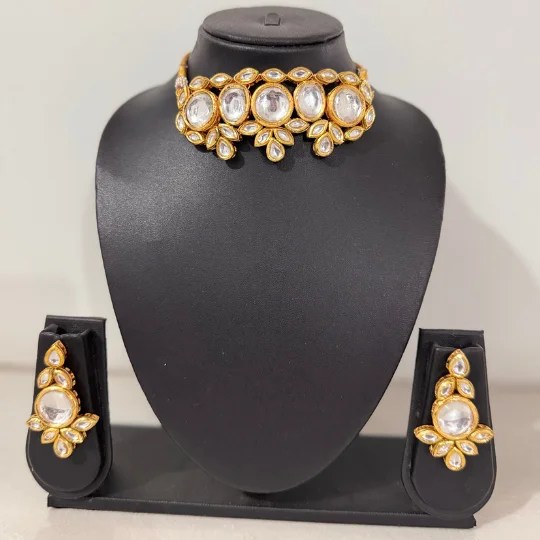 This is a statement Kundan choker set with bold, round stones and intricate detailing. Exquisite Kundan choker set featuring oversized round stones framed in gold with delicate teardrop motifs. Paired with matching earrings, it’s perfect for brides and festive occasions