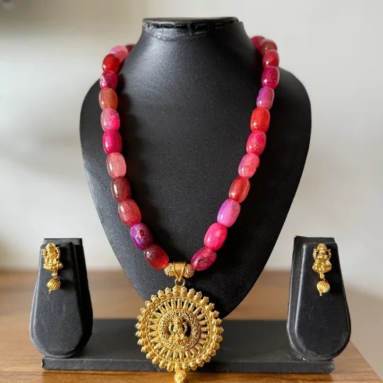 This stunning handcrafted jewelry set features a bold necklace and matching earrings, perfect for making a statement. The necklace is composed of large, oval shaped beads in a striking Pink color. These beads have a natural, semi-precious stone appearance. The centerpiece is a large, circular gold-toned pendant which features a finely detailed central figure of Goddess Lakshmi. The matching earrings are a simple yet elegant drop style.
